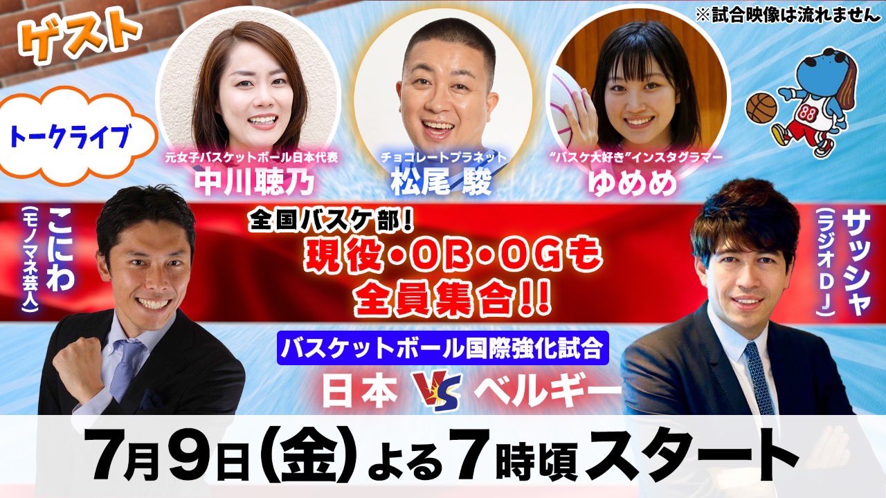 フジテレビ バスケットボール バスケ日本代表 国際強化試合21日本対ベルギー 今夜7時から生中継 副音声も Youtube生配信も 日本代表直筆サイン入り豪華プレゼントも 観ようぜ日本代表戦 Akatsukifive チョコレートプラネット 松尾駿 中川